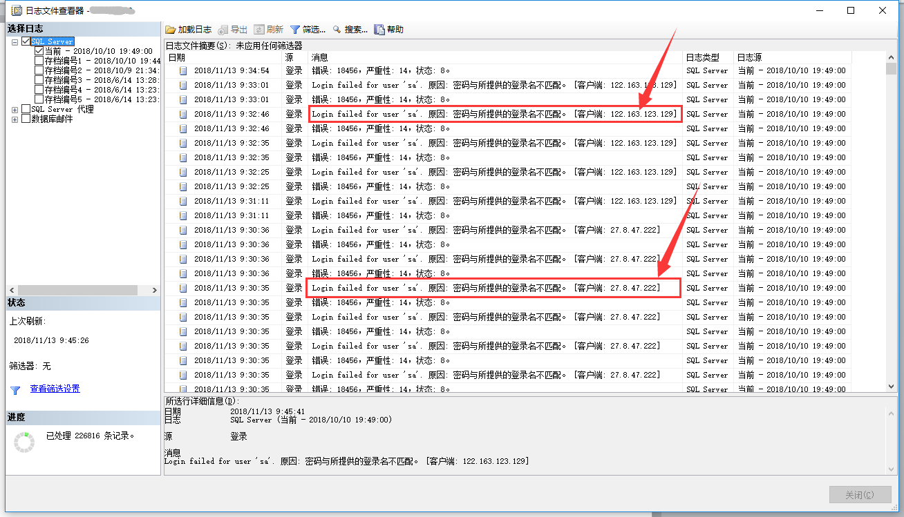可以看到,当前我的这台服务器已经有大量的IP在扫描尝试sa账户登录了,1秒钟可以多达几次,并且不止一个IP在扫描;