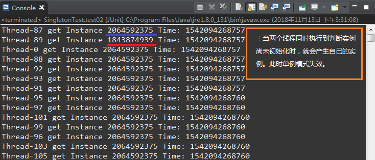 System.out.println(Thread.currentThread().getName()+" get Instance "+s.hashCode()+" Time: "+System.currentTimeMillis());