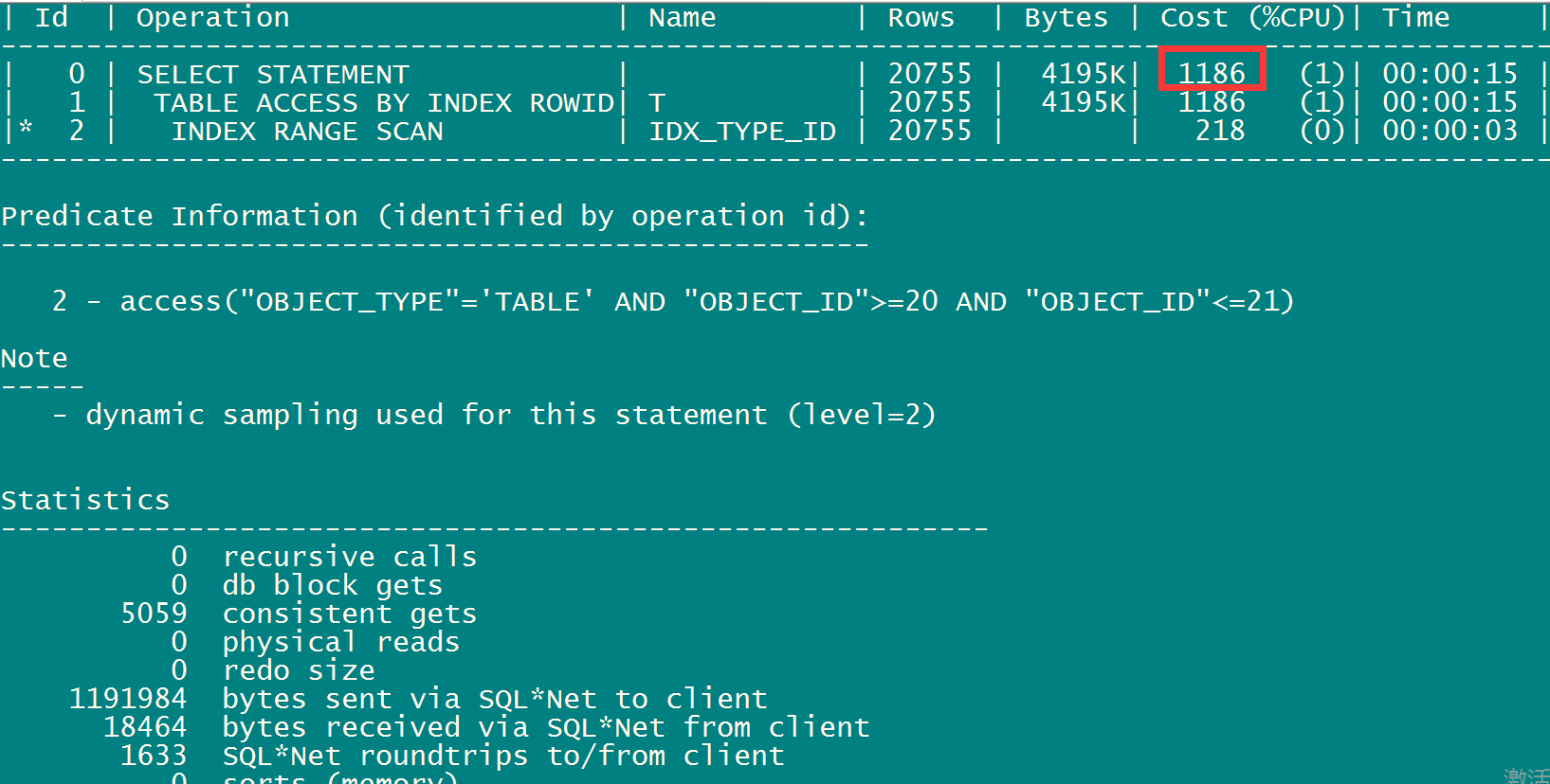 select /*+index(t,idx1_object_id)*/ * from t where object_TYPE='TABLE' AND OBJECT_ID >= 20 AND OBJECT_ID<= 21; --CPU cost消耗1186