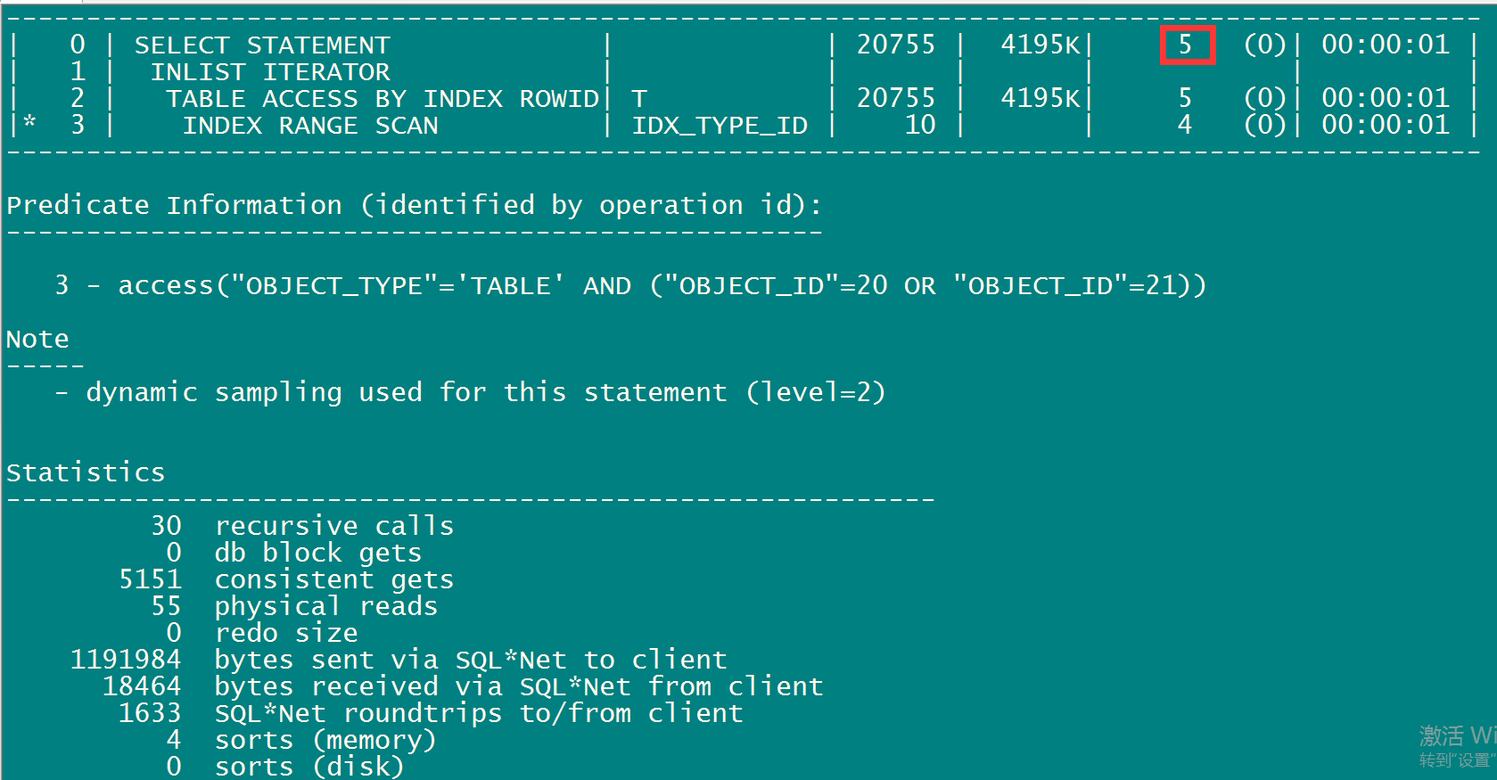 select /*+index(t,idx1_object_id)*/ * from t where object_TYPE='TABLE' AND OBJECT_ID in (20,21); -- CPU cost消耗仅仅为5