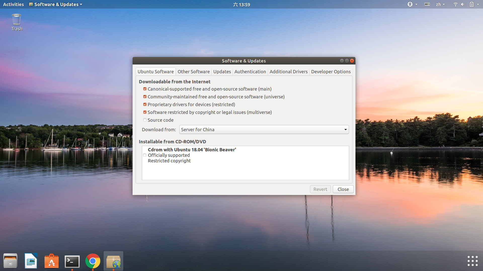 打开后,因为有人说,国内网络情况不是很好,下载Ubuntu的很多东西,会失败,或者很慢,建议Download from 阿里云的镜像,但我发现打开software & updates之后,Download from 后面显示的是Server from China,所以我就没改,it works。