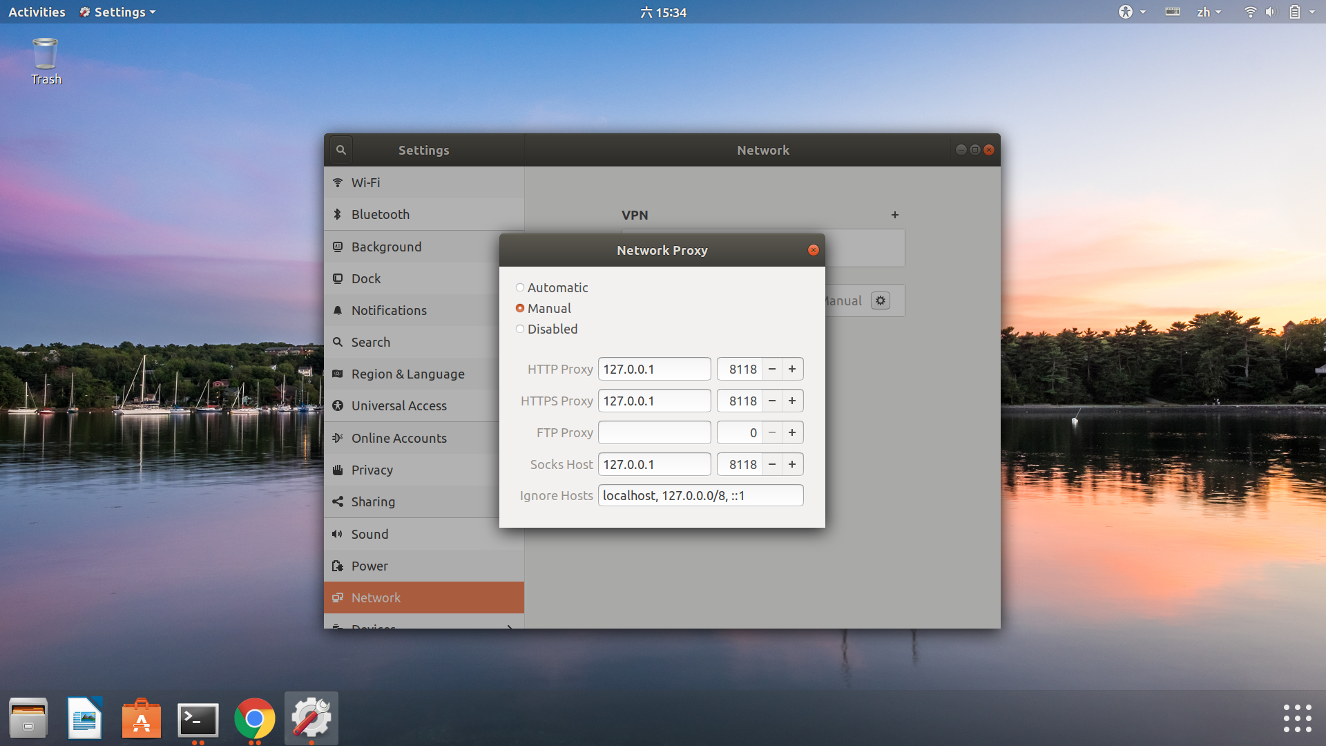 即本机发往8118端口的http请求,都会被转到我们配置的sock5代理端口,即127.0.0.1:1080。