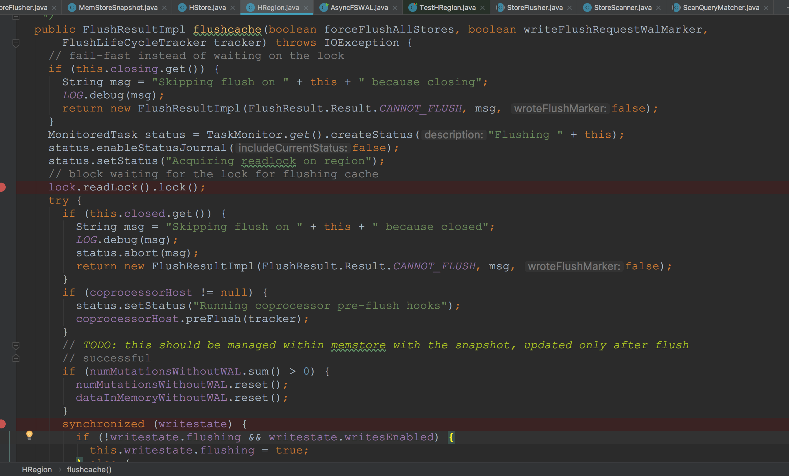 首先,让我们来到今天的入口方法HRegion.flushcache:下图的代码不少,但是,并没有我们今天要介绍的重点。此图只是用来表示我们今天要讲的方法。