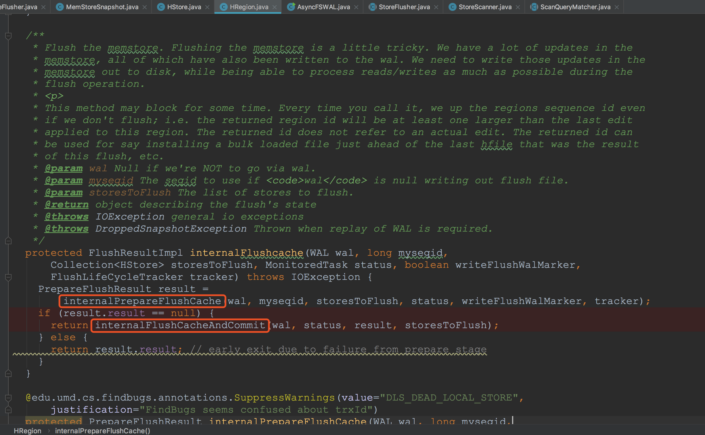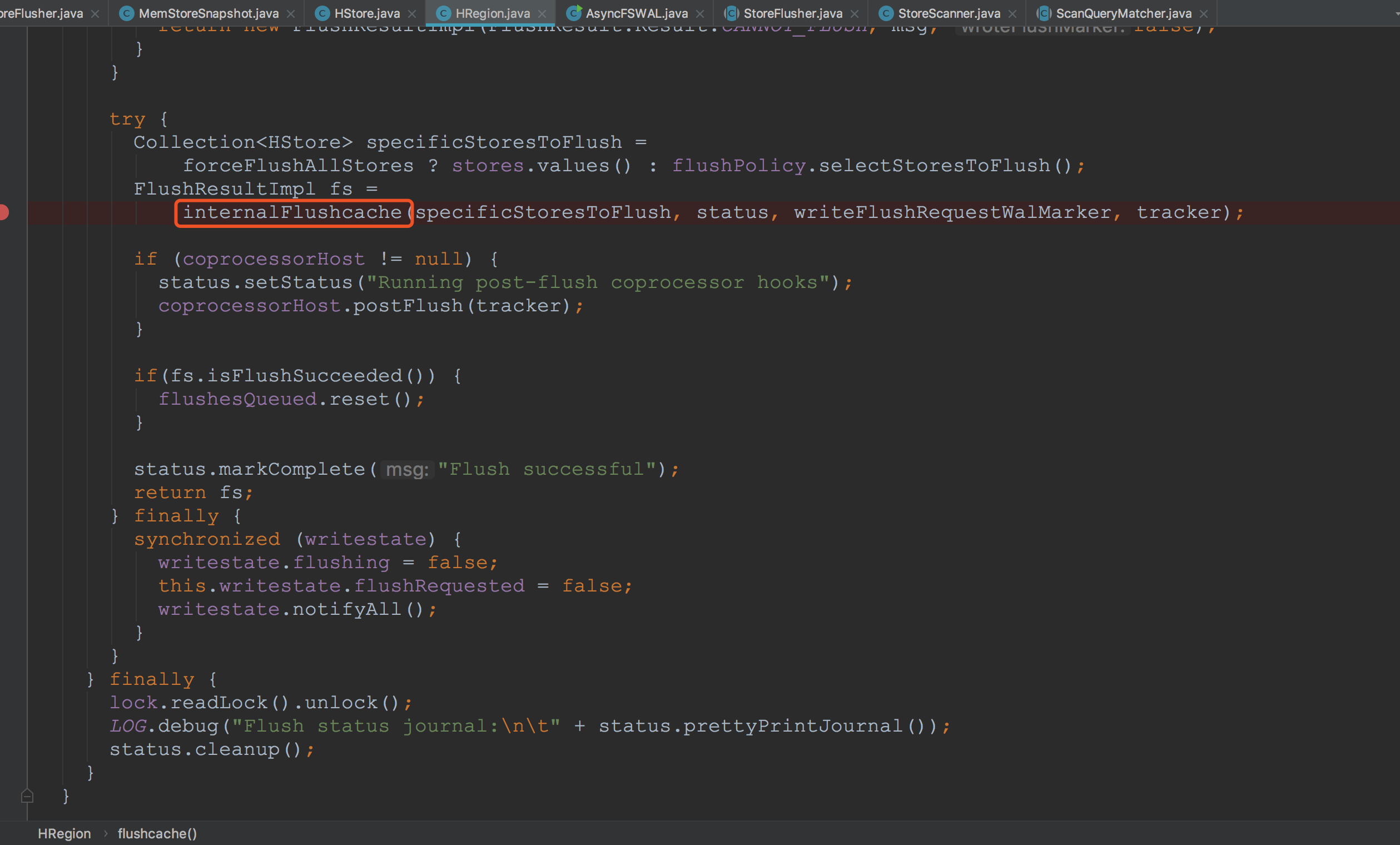 其实,重点的入口方法是下图的框选方法internalFlushcache。由该方法名,我们就可以猜到该方法应该就是我们要找的方法。