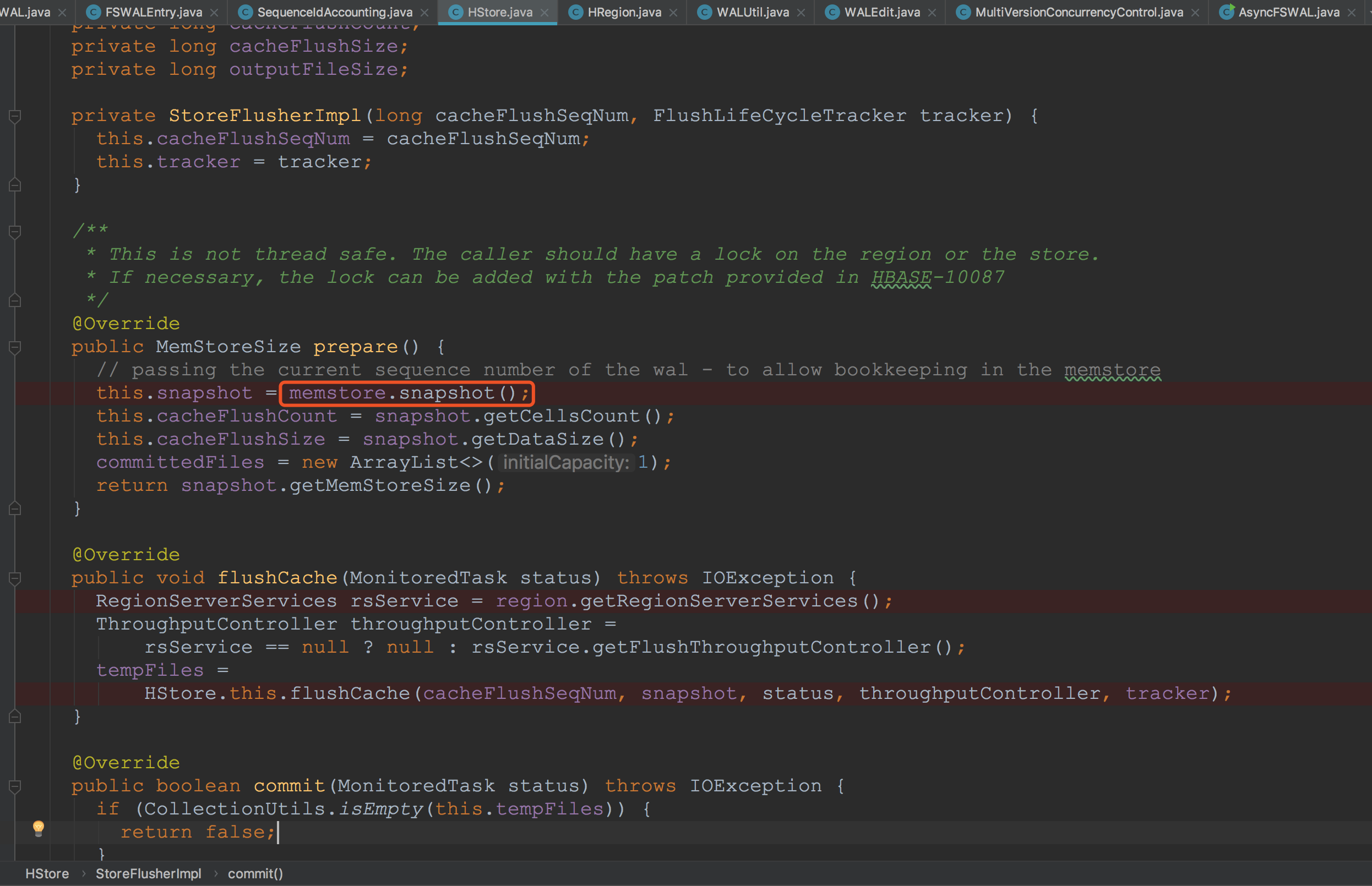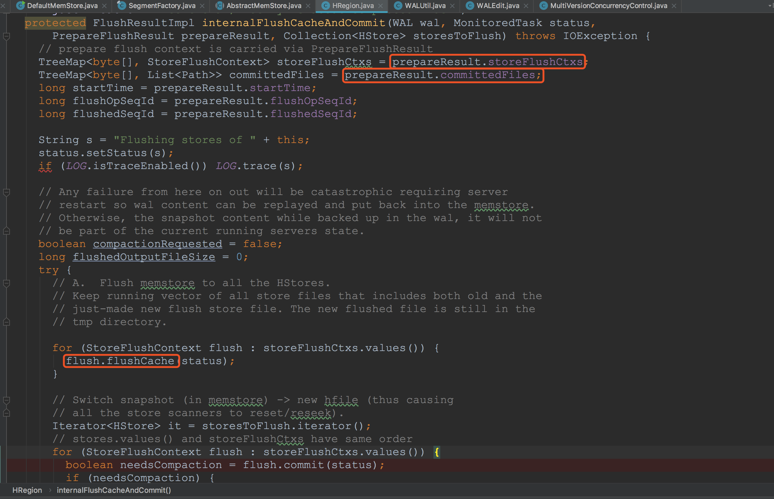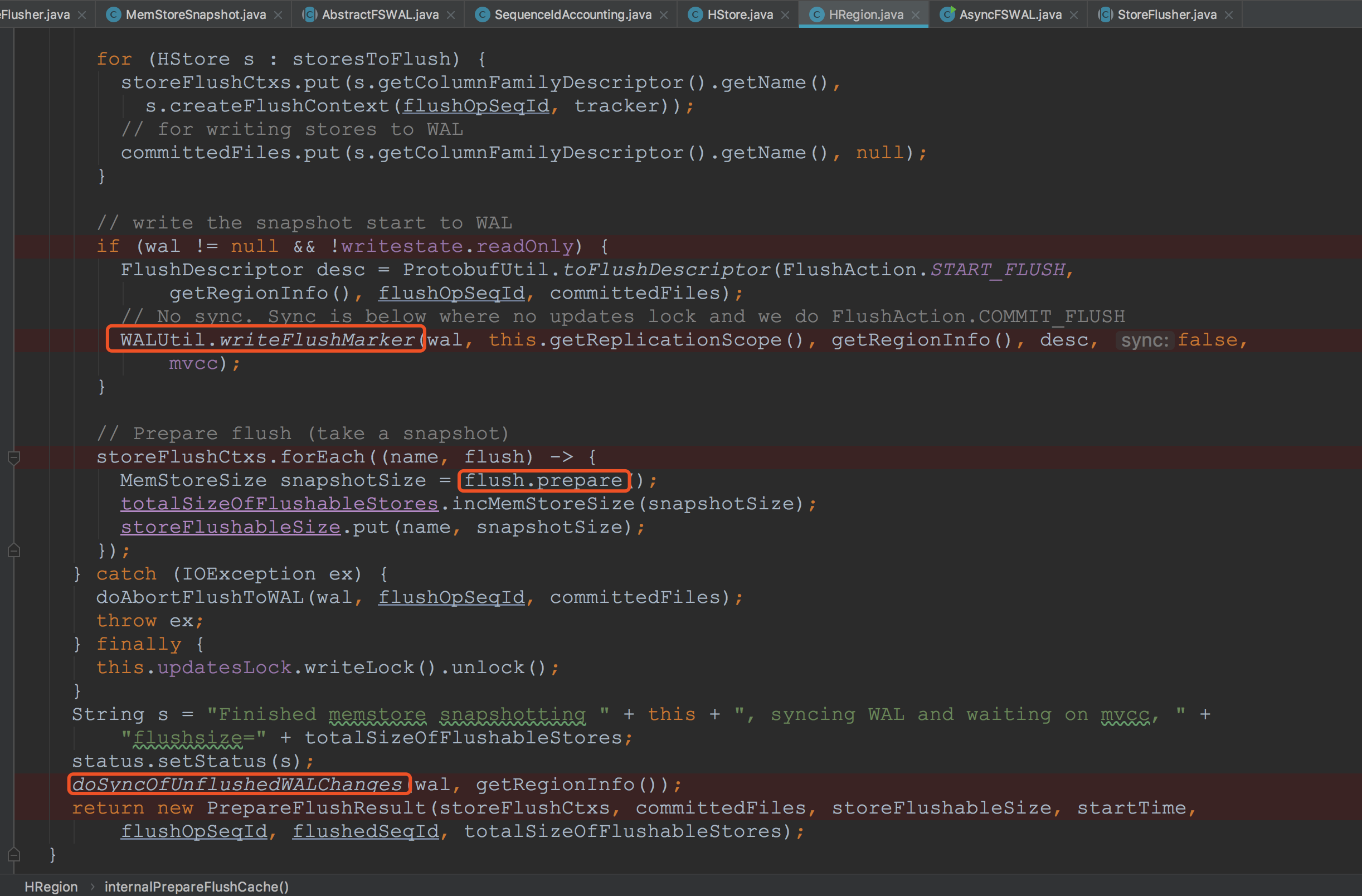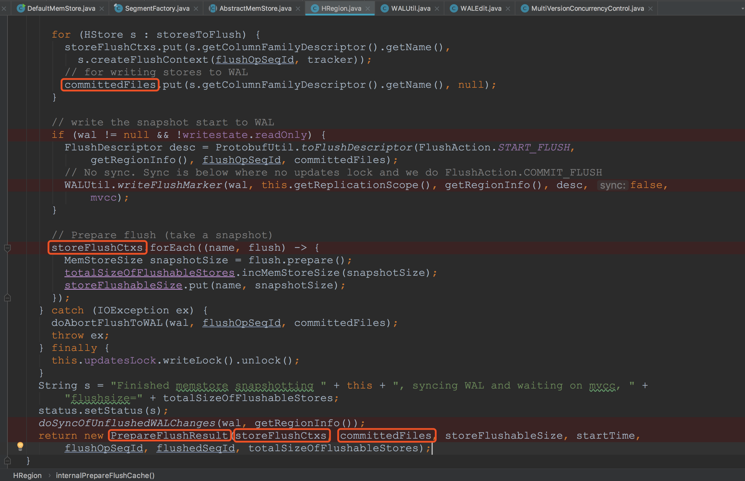 下面,我们来到第一个方法,也就是HRegion.internalPrepareFlushCache。这个方法的内容很多,但是与我们今天流程相关并不是很多,如下图所示的代码: