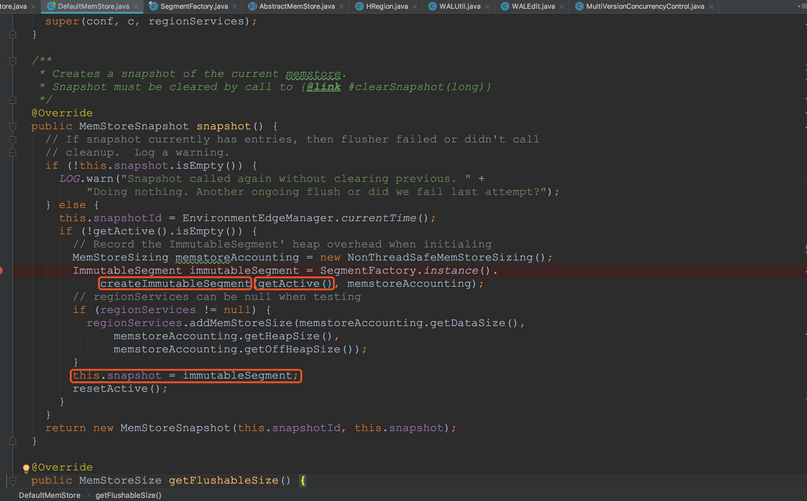 来到DefaultMemStore.snapshot,看一下我特地为大家标注的。首先,根据当前的active创建ImmutableSegment,然后将刚刚创建的ImmutableSegment赋给成员变量snapshot,最后,调用resetActive重置了当前的active为MutableSegment。这里不是很难,就不详细介绍了,大家有兴趣可以追查一下源码。