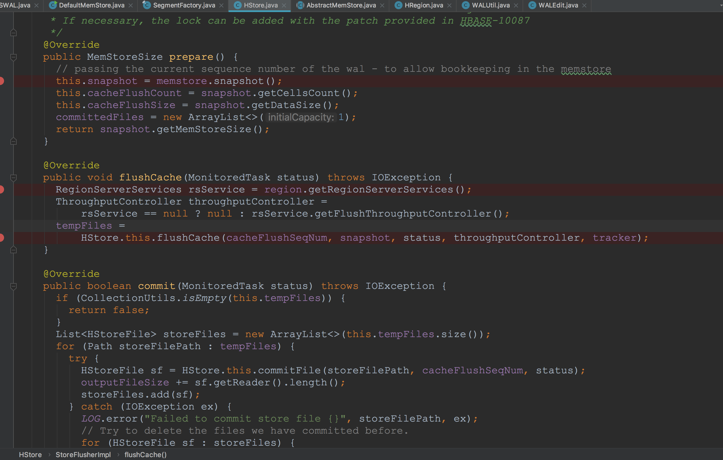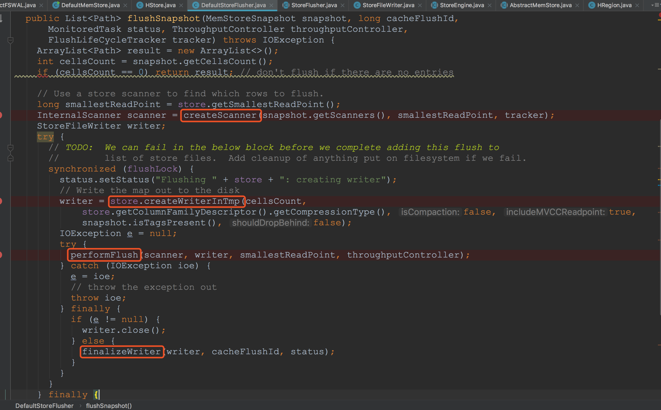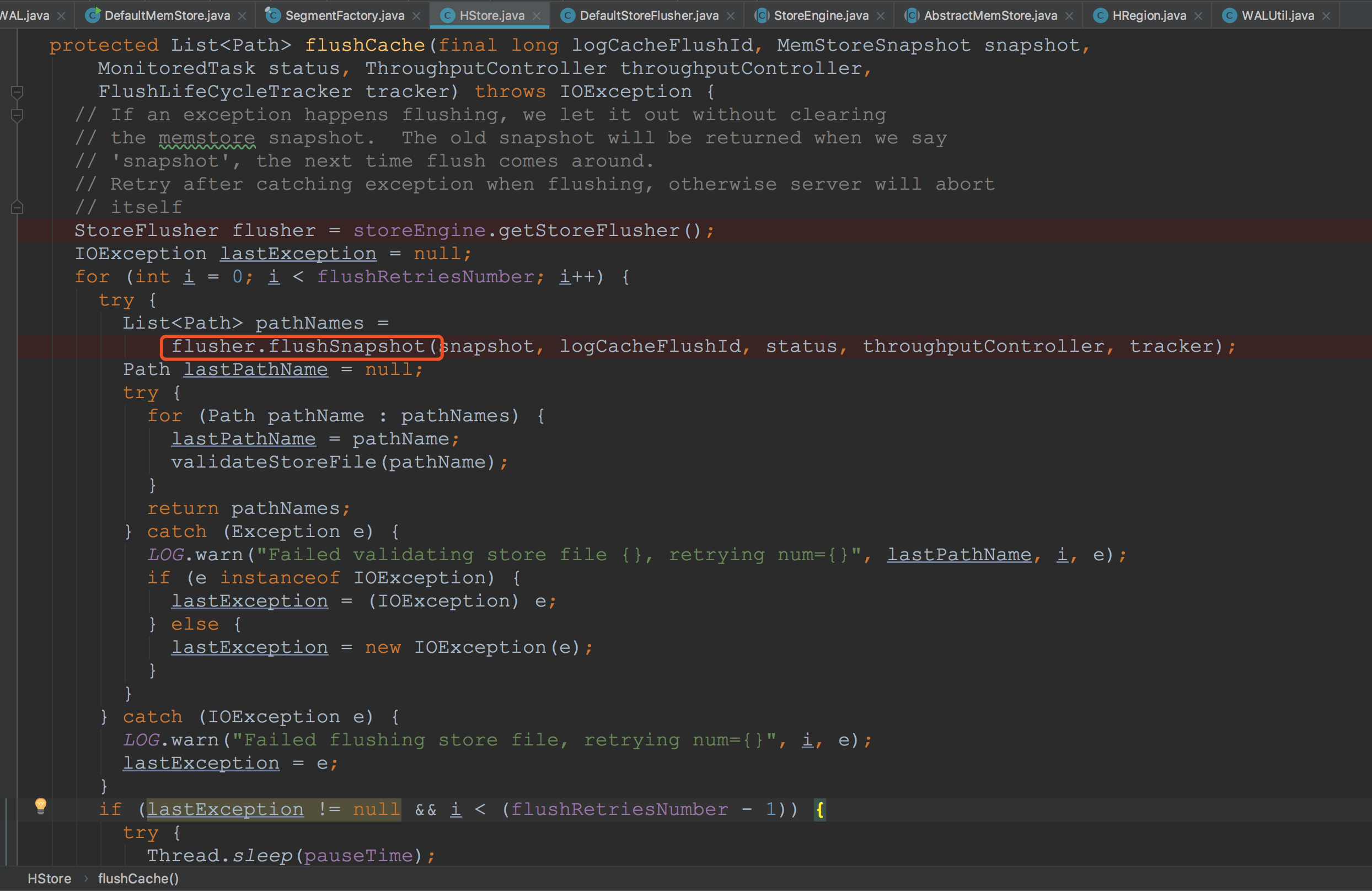 接着,让我们继续往下走,来到HStore.StoreFlusherImpl.flushCache方法。