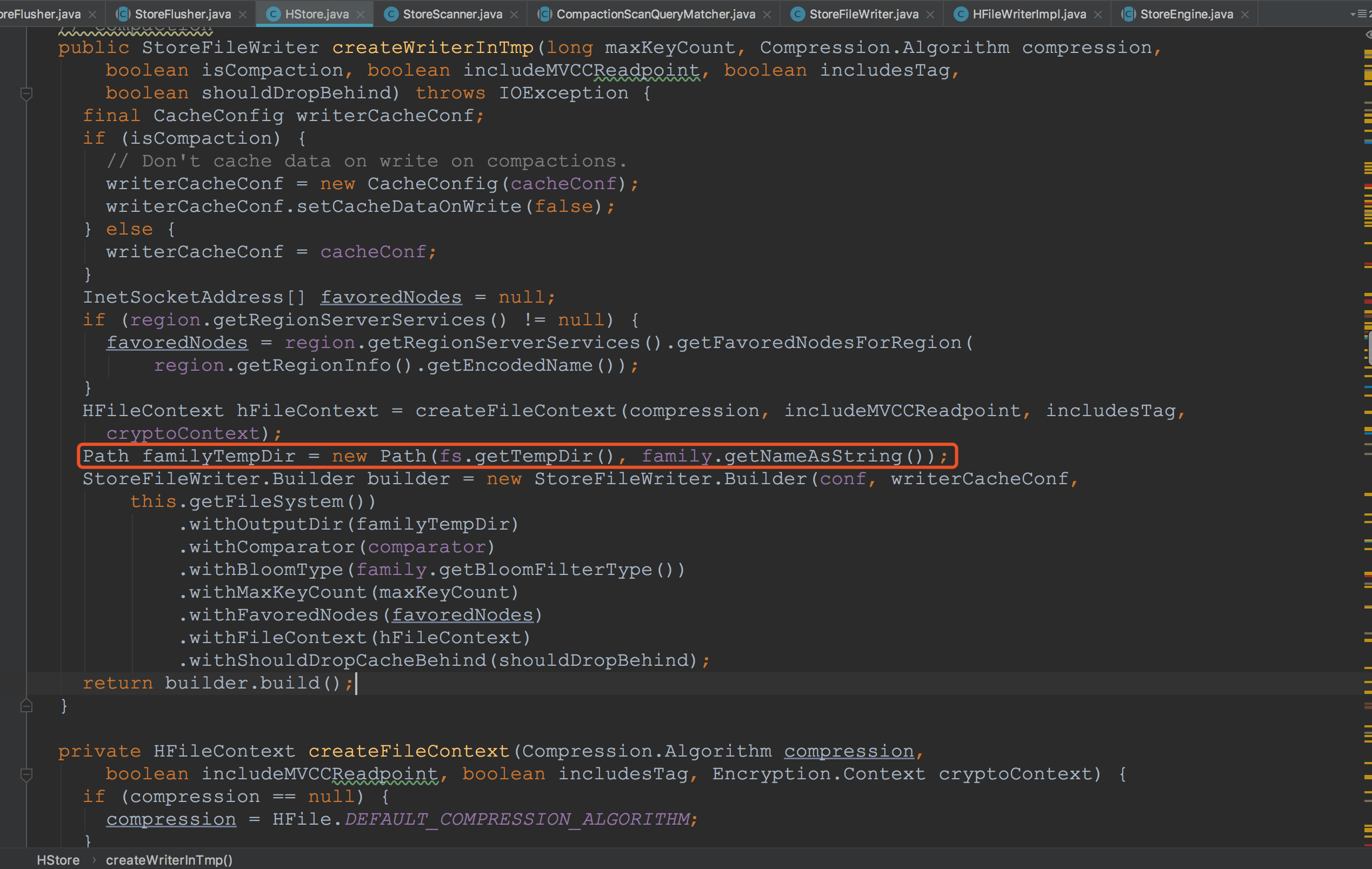 首先,我们来到HStore.createWriterInTmp方法。在这个方法中,获取了familyTempDir路径。该路径是regionDir/.tmp/family.getNameAsString()。然后构建了StoreFileWriter。