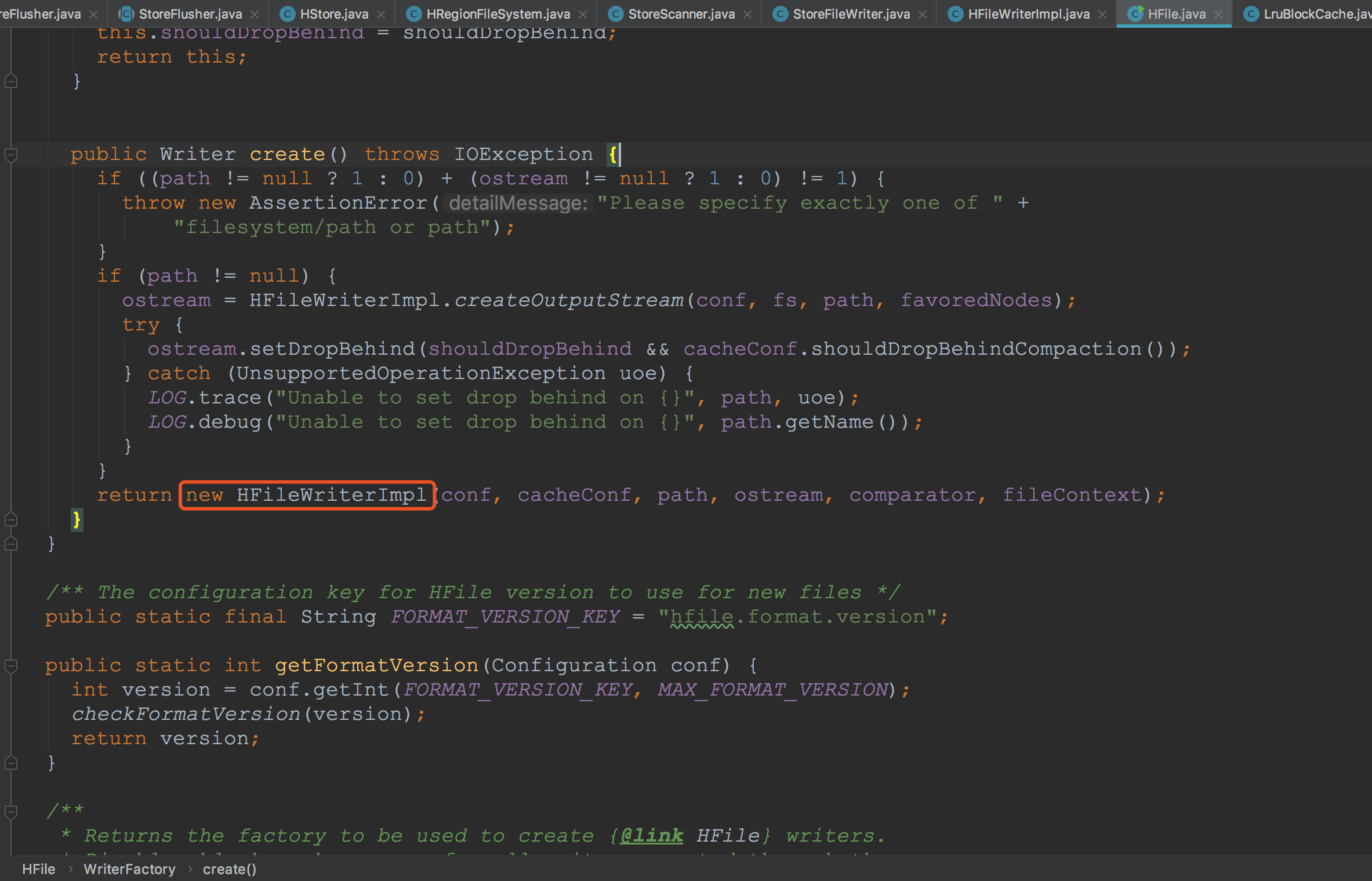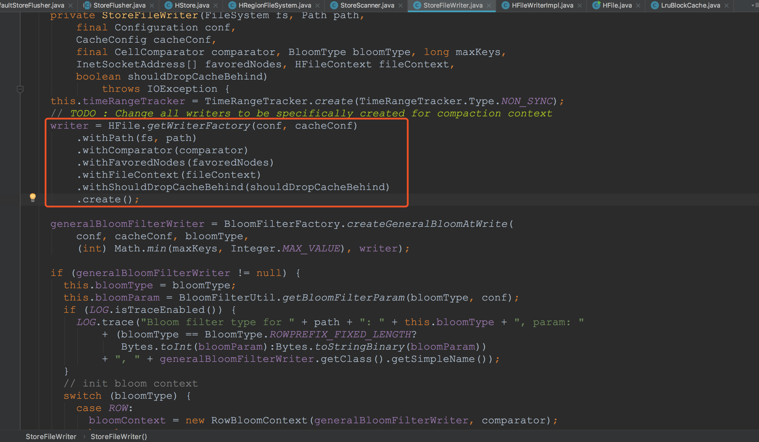 对于StoreFileWriter的构造方法是比较重要的,特别是其writer的构建,我在下图特别作了标示。