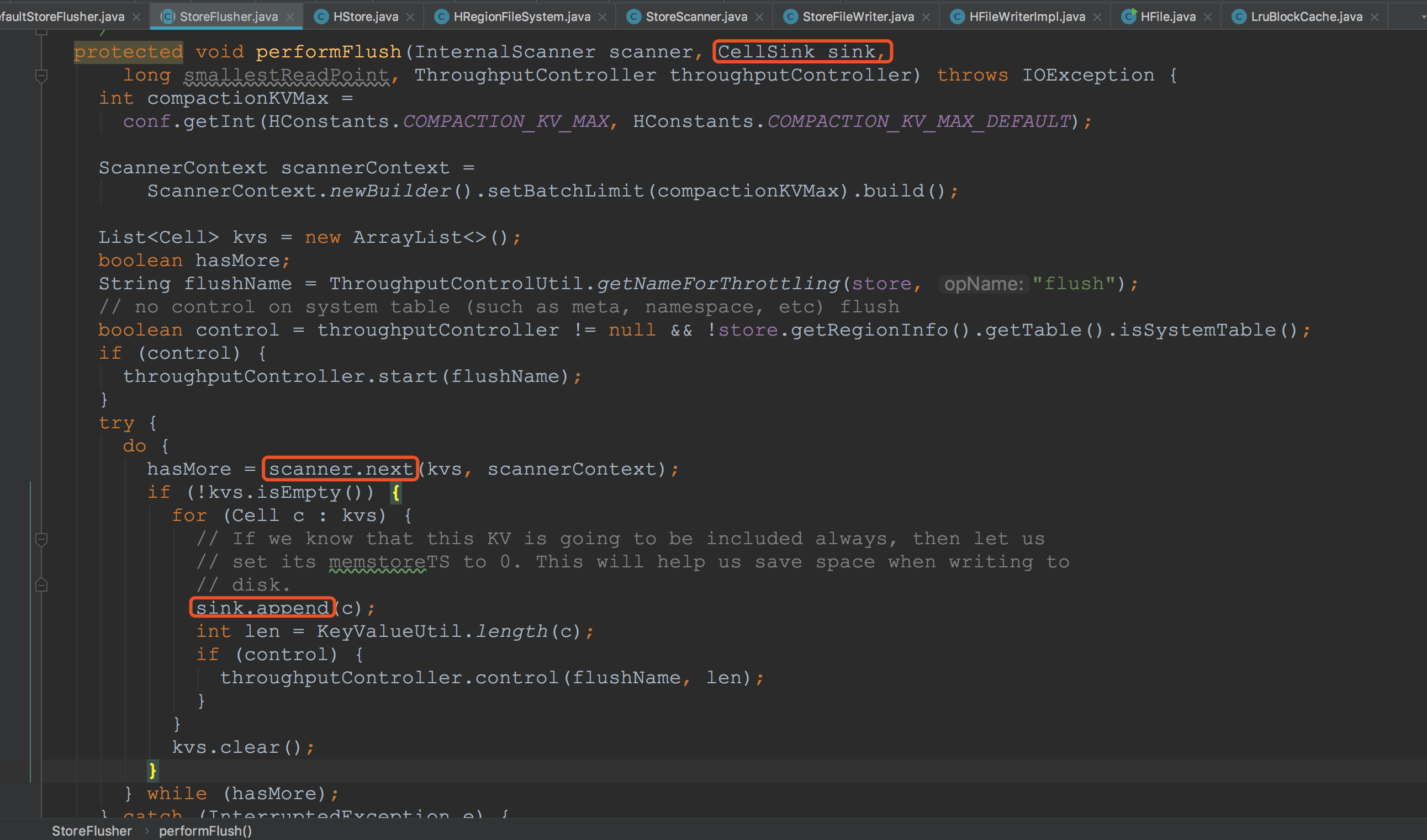 接着,我们来到StoreFlusher.performFlush。你可能会对我在下图标注的sink比较懵逼。但是仔细想一想,你可能就猜到了,这里的sink正是上面我们重点描述的HFileWriterImpl。也就是说下面调用的sink.append正是HFileWriterImpl.append。