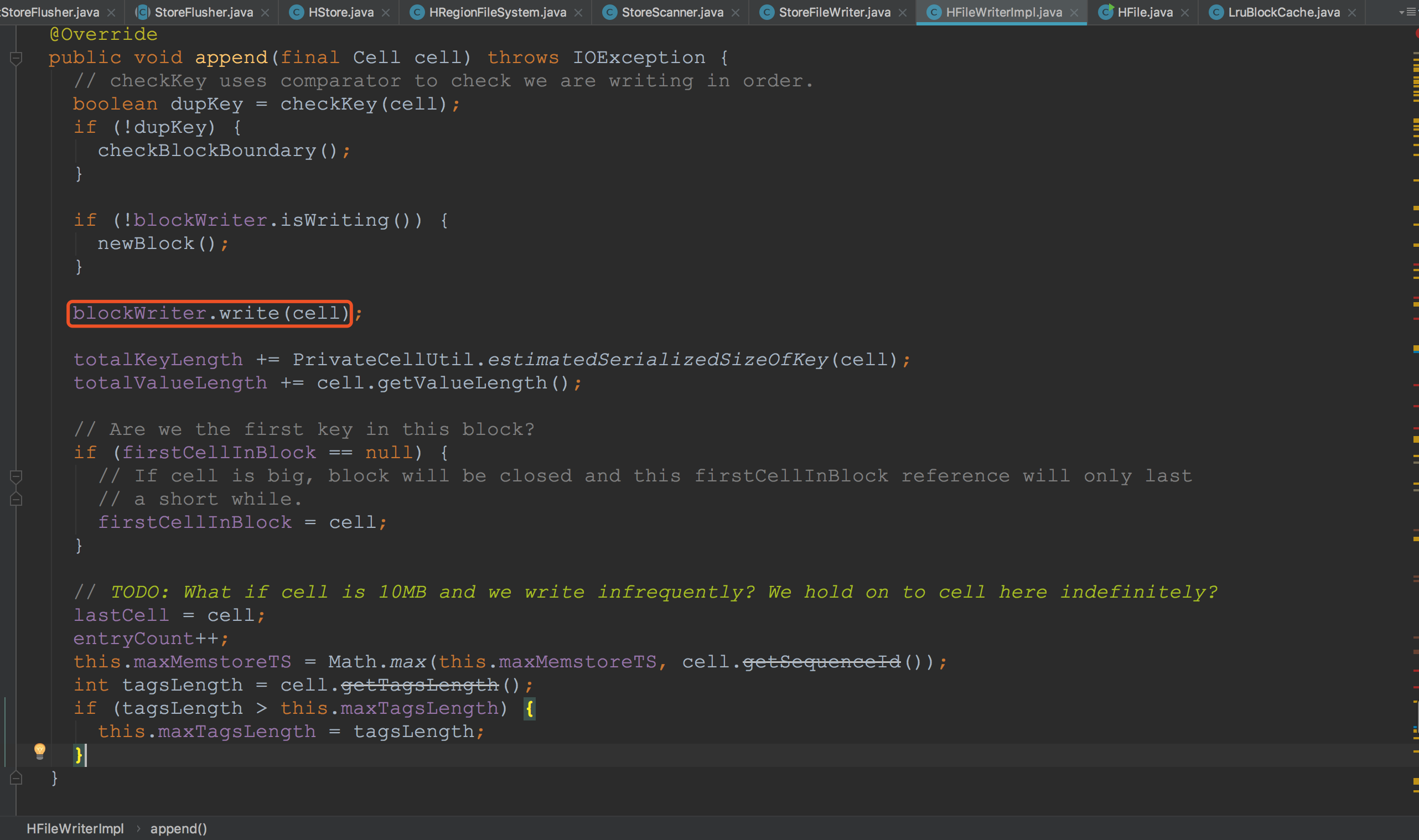 下图所示正是HFileWriterImpl.append。这里我们就不详细叙述了,留待下一节具体分析。