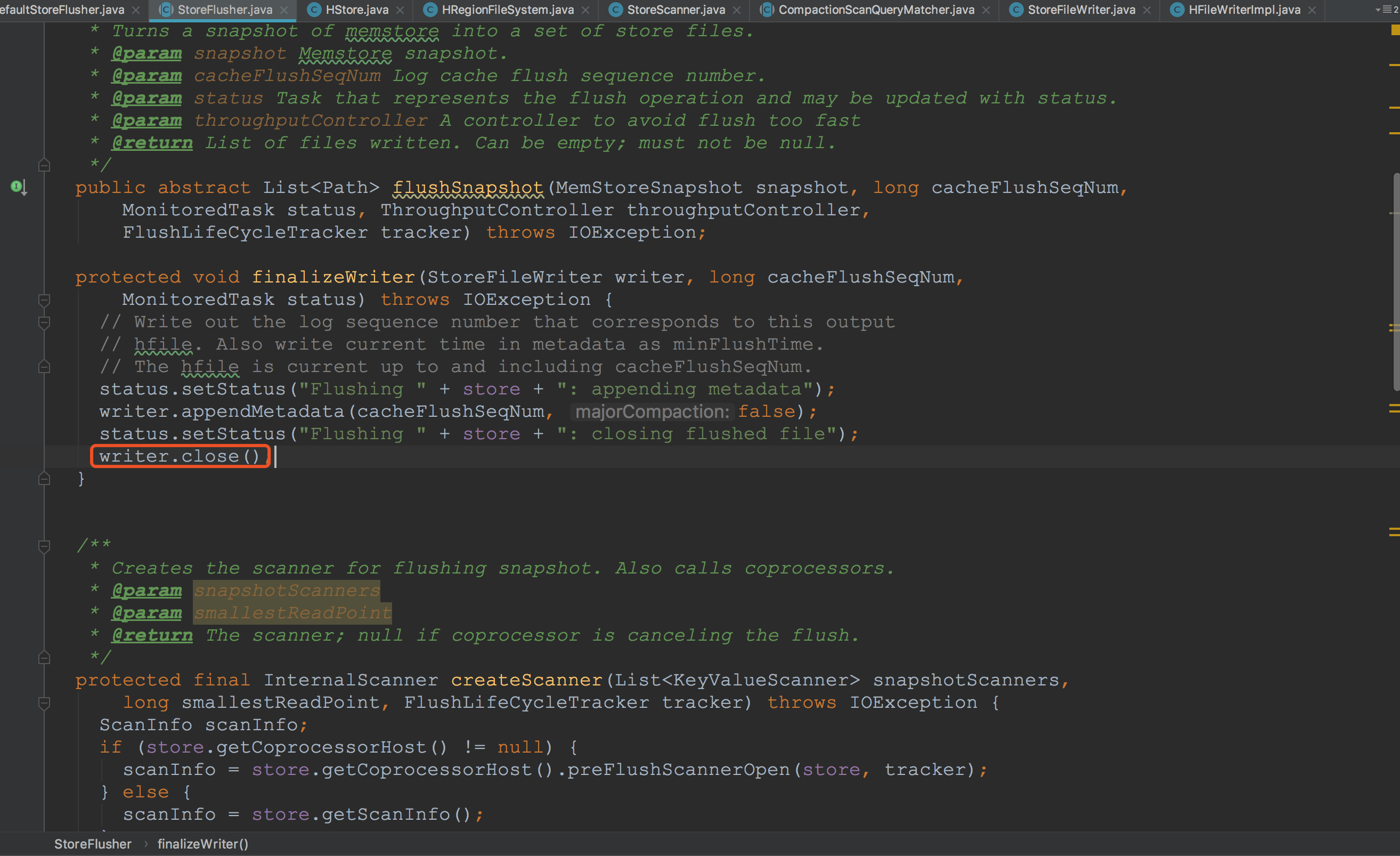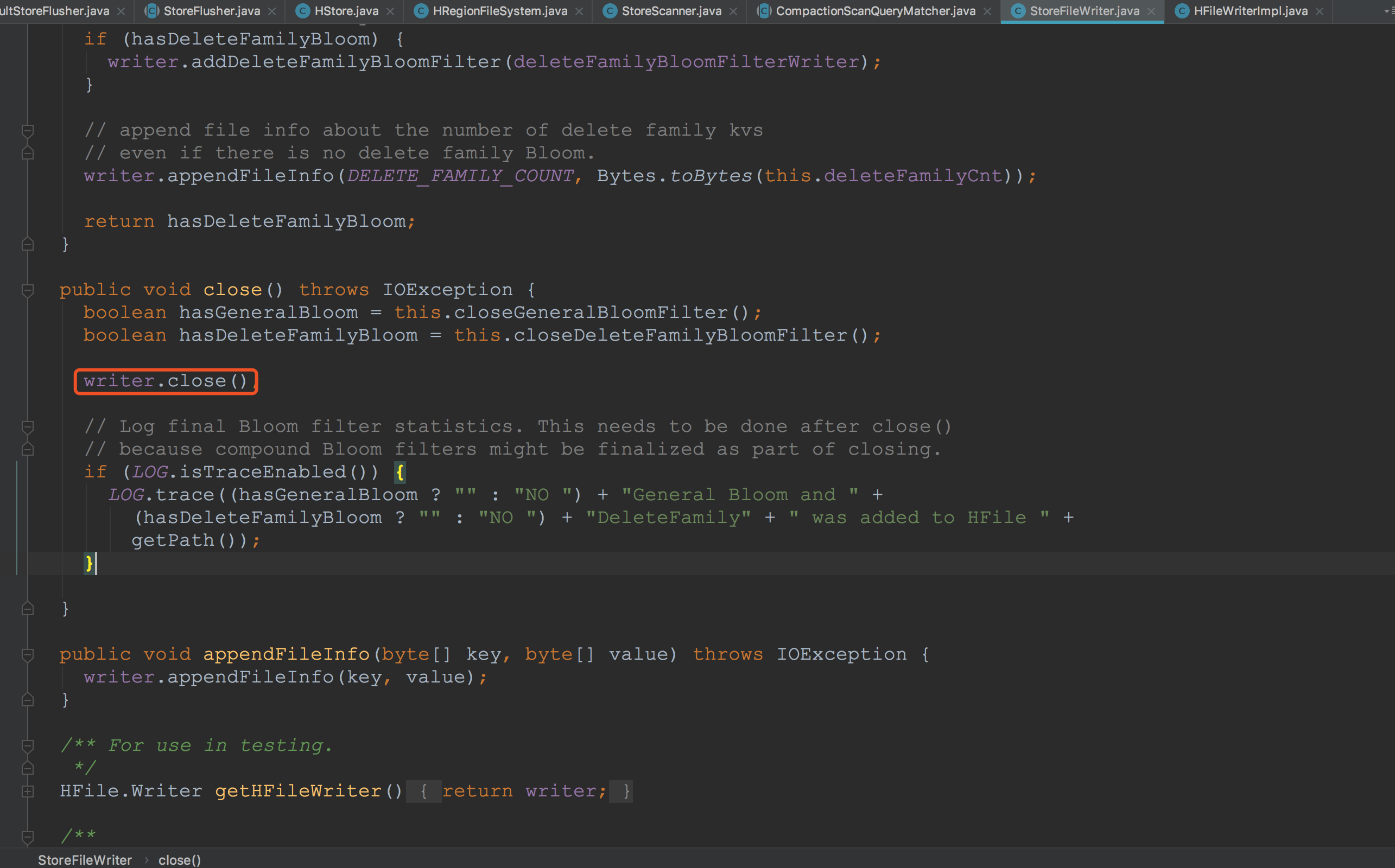 接下来,就是真正的持久化方法:finalizeWriter。显然,在这里调用了writer.close。这里的writer类型是StoreFileWriter。