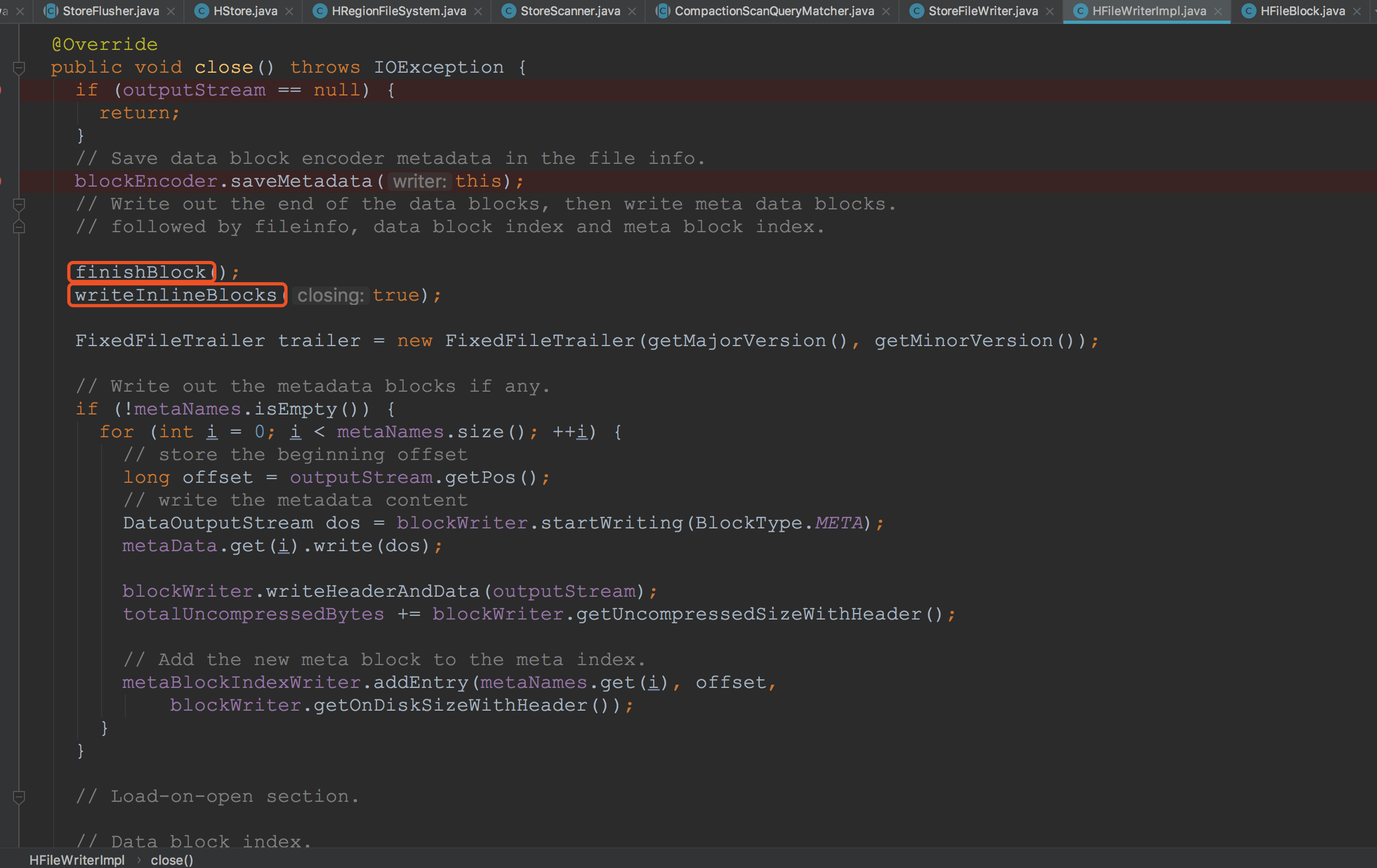 继续往下走,来到StoreFileWriter.close。而这里的writer正是我们刚刚再三强调的HFileWriterImpl。