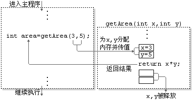 从上图中可以看出,在程序运行期间,参数x和y相当于在内存中定义的两个变量。当调用getArea()方法时,传入的参数3和5分别赋值给变量x和y,并将x*y的结果通过return语句返回,整个方法的调用过程结束,变量x和y被释放。