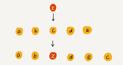 如果数组元素是没有顺序的(或不需要保证元素顺序),向数组中间位置插入一个元素x,只需要将插入位置的元素放到数组的末尾,然后将x插入,这时候不需要搬移元素,时间复杂度仍为O(1),如: