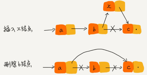 在数组里插入或删除数据需要保证内存空间的连续性,需要做数据的搬移,但是链表里数据内存空间是独立的,插入删除只需要改变指针指向即可,所以链表的插入删除非常高效。如图: