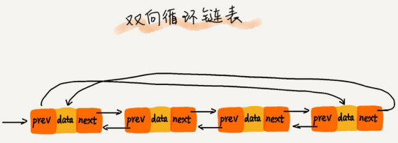 与循环链表类似,尾结点指向头结点,同时每个结点除了保存自身数据,分别有一个前驱指针和后继指针,就形成了双向循环链表: