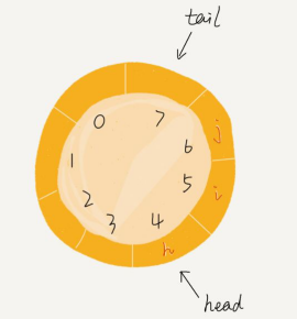 数组实现队列时,当队列满了,头部出队时候,会发生数据搬移,但是如果是一个首尾相连的环形结构,如下图,头部有空间,尾部到达7位置,再添加元素时候,tail到达环形的第一个位置(下标为0)不需要搬移数据。