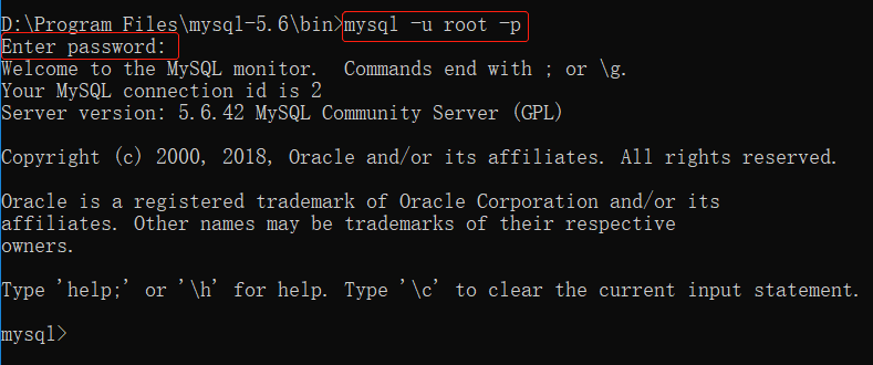 输入 mysql -u root -p ,回车,出现 Enter passwore: ,输入密码,由于刚安装,没有设置密码,直接回车 Enter 进入