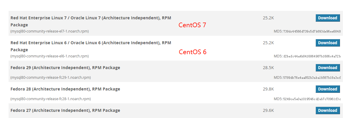 1.1、到MySQL官网下载MySQL Yum存储库(https://dev.mysql.com/downloads/repo/yum/)