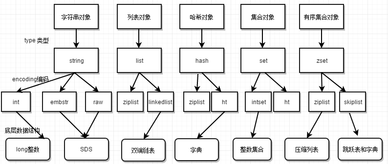 通过这五种不同类型的对象,可以针对不同的使用场景, 在Redis 内部会为对象设置不同的数据结构实现,从而优化对象在不同场景下的使用效率。下面先直观看下关系图(五种对象与type与encoding编码与ptr底层数据结构),然后再来详细介绍它们之间的关系。