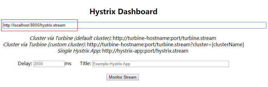 确认服务可以正常访问之后,在监控地址内输入 http://localhost:8005/hystrix.stream,然后点击 Monitor Stream 开始监控。
