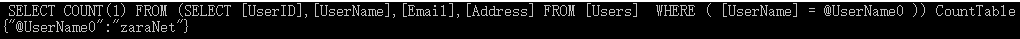 INSERT INTO [Users]([UserName],[Email],[Address])VALUES(@UserName,@Email,@Address) ;{"@UserName":"zara1","@Email":"sad","@Address":"asd"} INSERT [Users] ([UserName],[Email],[Address])SELECT N'zara1' AS [UserName],N'sad' AS [Email],N'asd' AS [Address]UNION ALLSELECT N'zaranet' AS [UserName],N'asd' AS [Email],N'zxc' AS [Address] |