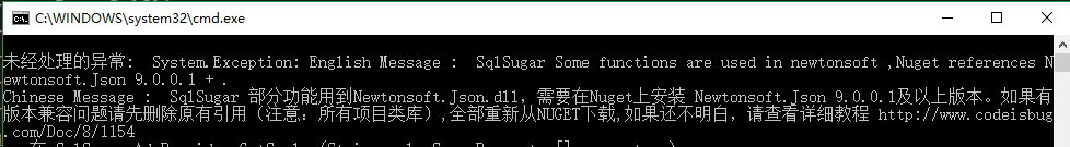 其中需要注意的是使用SqlSugar的部分功能的时候,一定要引用newtonSoft.json.dll 9.0.1及以上版本,否则会出现一些错误,比如: