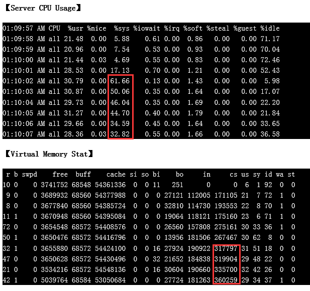 最近有台服务器晚上CPU告警,系统抓取的故障期间的snapshot显示CPU %sys较高,同时context switch在300K以上。