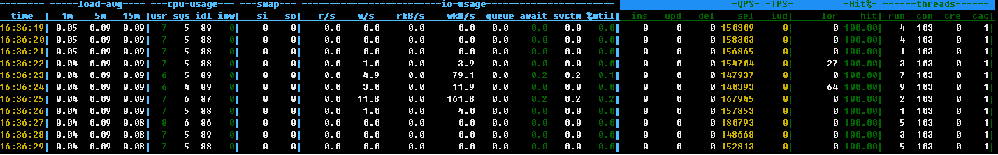 用mysqlslap并发100个线程执行select 1语句,可以看到QPS压到15W
