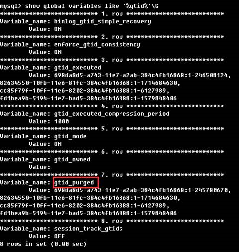 1、到对应的master上查询当前gtid_purged值,show global variables like '%gtid%'; 并记录下来