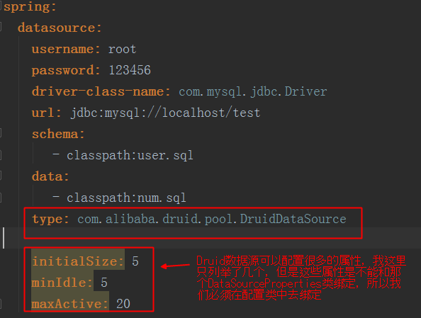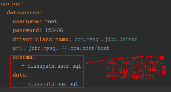 在yml文件里面,指定spring.datasource.schema和spring.datasource.data(我们配置的这个也会绑定到那个DataSourceProperties类上)