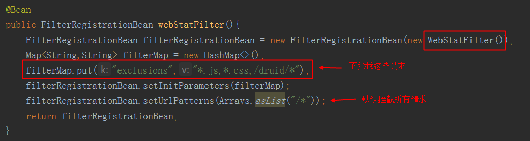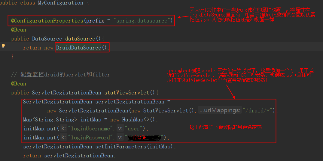 所以,配置类中除了要配置一下数据源和yml文件绑定,还要另外设置一个Servlet,以及Filter