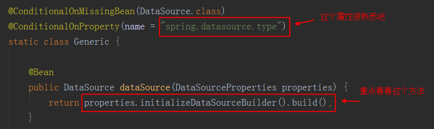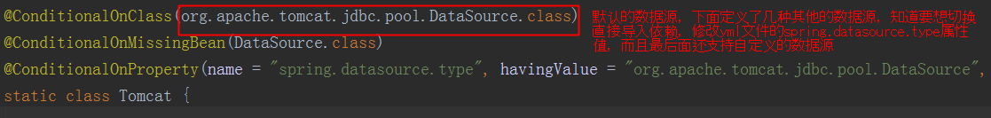 ok,大概的看了看自定义数据源的源码,其实也就那样,不过也提醒了我们,假如我们要更换数据源。可以先来看看这个配置类里面有没有符合条件的,有的话直接导入依赖,然后sprin.datasource.type=xxx,以及修改一些默认参数;没有的话就自定义,其实还是导入依赖,然后配置一下独有的属性(如果配置独有属性就要在配置类中配个DataSource了)。