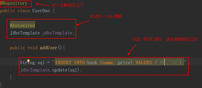还是由于我个人比较懒,我只用到Dao层,就实现一个add方法,再用一下测试方法;咳咳,不要在意细节。