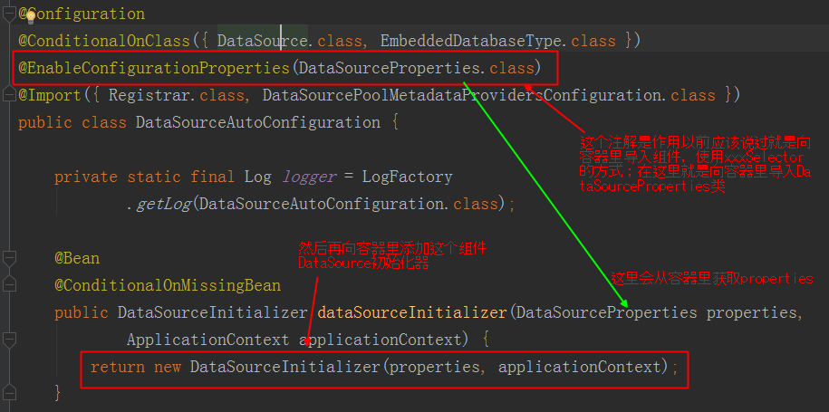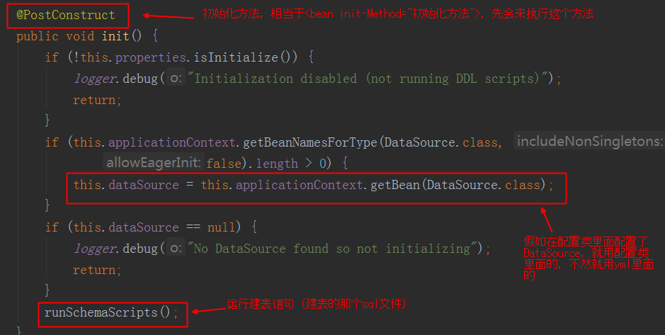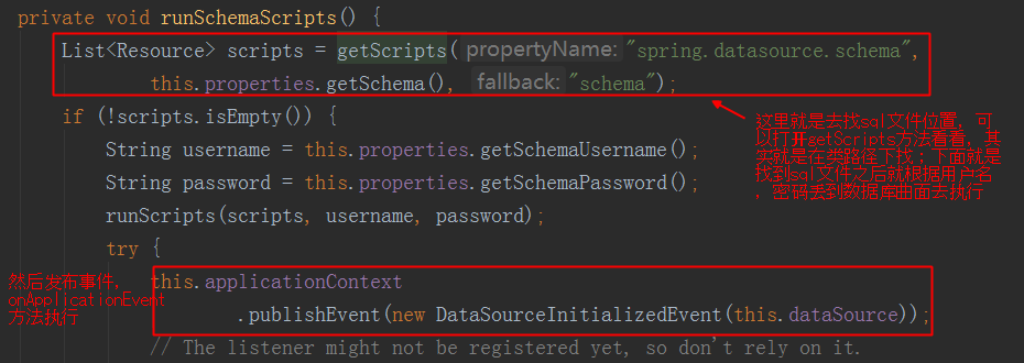 总结:自动配置类DataSourceAutoConfiguration启动---------->向容器里导入DataSourceProperties类(和我们写的yml绑定),DataSourceInitializer(本质就是一个监听器)------------->将DataSourceProperties类绑定属性值和ioc容器都传入监听器------------------>监听器内部有个初始化方法运行建表语句(通过路径拼接schema-all.sql和schema.sql拿到文件,利用用户名和密码连接数据库运行)----------->向数据库执行建表语句并且ioc容器发布事件---------------------->发布事件又会触发onApplicationEvent方法--------------------->利用用户名和密码执行插入数据的sql文件(内部也是先要进行路径拼接成类路径data-all.xml和data.xml,拿到文件)