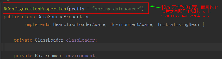 最重要的就是这个初始化器干了什么,在此之前,可以打开那个properties类(DataSourceProperties),可以发现这就是一个和配置文件绑定的类,我们在yml文件里配置的数据源其实就是和这个类绑定的(可以直接在yml文件里属性那里ctrl+鼠标左键进入)