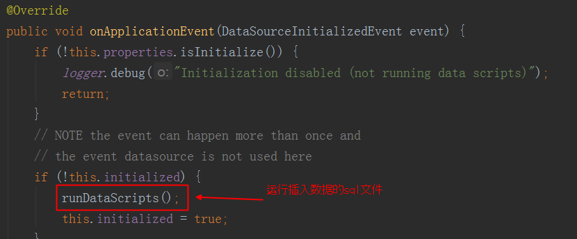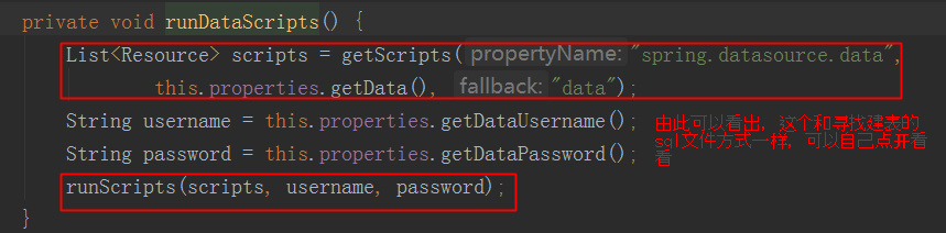 进入runDataScripts方法,其实就跟上面一样,只是换了一个参数,把schema换成了data,所以插入数据的sql文件默认是在类路径下data-all.sql和data.sql