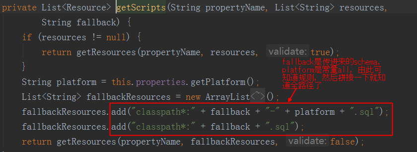我们再来看看runSchemaScripts方法是怎么找到sql文件的