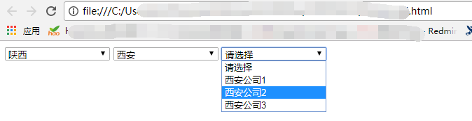 1 <select id='province' style="background:#FFF; color:#000;width:150px"> 2 </select> 3 <select id='city' style="background:#FFF; color:#000;width:150px"> 4 </select> 5 <select id='company' style="background:#FFF; color:#000;width:150px"> 6 </select>