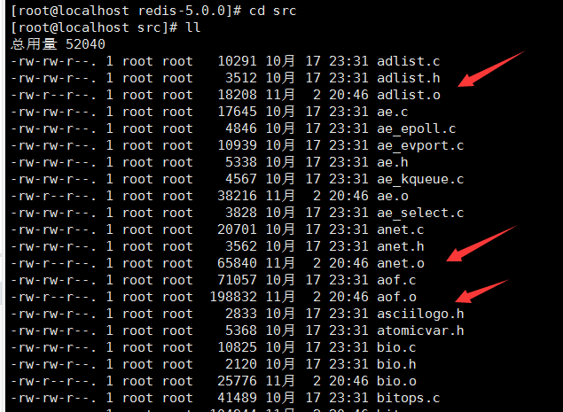 执行完毕之后,进入redis目录下的src文件,发现出现了不少.o结尾的编译目标文件