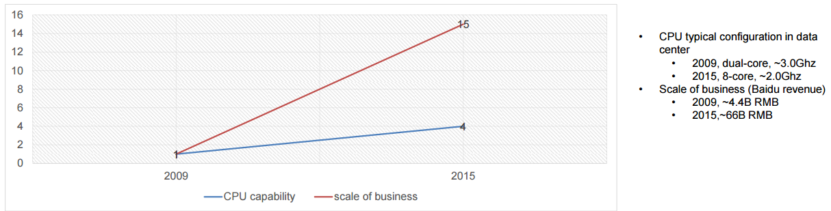 正如刚刚我们谈到的,Google 寻找一切可能的方法去打败摩尔定律,百度也在进行相同的探索,而令人激动的、使人着迷的机器学习工作是迷人的,业务的核心关键任务的加速同样也是,因为必须如此。欧阳提到,公司基于自身的数据提供高端服务的需求和 CPU 可以承载的能力之间的差距将会逐渐增大。
