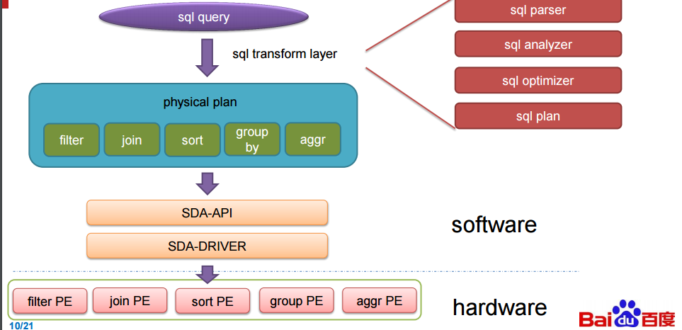 SDA 架构采用一种数据流模型,加速单元不支持的操作被退回到数据库系统然后在那里本地运行,比其他任何因素,百度开发的 SQL 加速卡的性能被 FPGA 卡的内存带宽所限制。加速卡跨整个集群机器工作,顺便提一下,但是数据和 SQL 操作如何分发到多个机器的准确原理没有被百度披露。