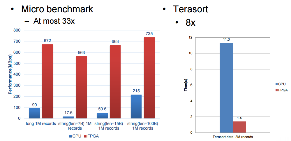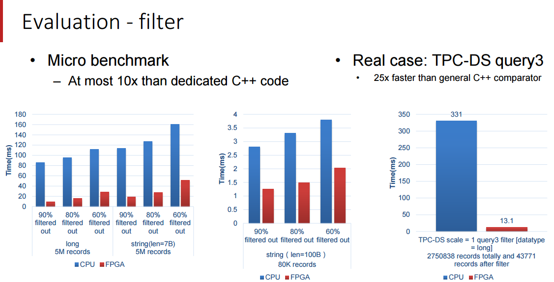 欧阳提到了一件事,他们的加速器受限于 FPGA 的带宽,不然性能表现本可以更高,在下面的评价中,百度安装了 2 块12 核心,主频 2.0 GHz 的 intl E26230 CPU,运行在 128G 内存。SDA 具有 5 个处理单元,(上图中的 300MHz FPGA 主板)每个分别处理不同的核心功能(筛选(filter),排序(sort),聚合(aggregate),联合(join)和分组(group by))