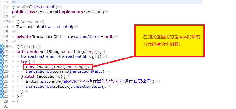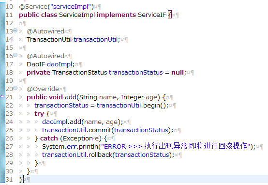 1 @Service("serviceImpl") 2 public class ServiceImpl implements ServiceIF { 3 4 @Autowired 5 TransactionUtil transactionUtil; 6 7 private TransactionStatus transactionStatus = null; 8 9 @Override10 public void add(String name, Integer age) {11 transactionStatus = transactionUtil.begin();12 try {13 new DaoImpl().add(name, age);14 transactionUtil.commit(transactionStatus);15 } catch (Exception e) {16 System.err.println("ERROR >>> 执行出现异常 即将进行回滚操作");17 transactionUtil.rollback(transactionStatus);18 }19 }20 }DaoImpl.java