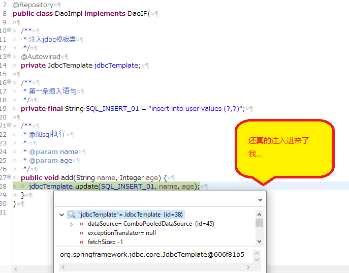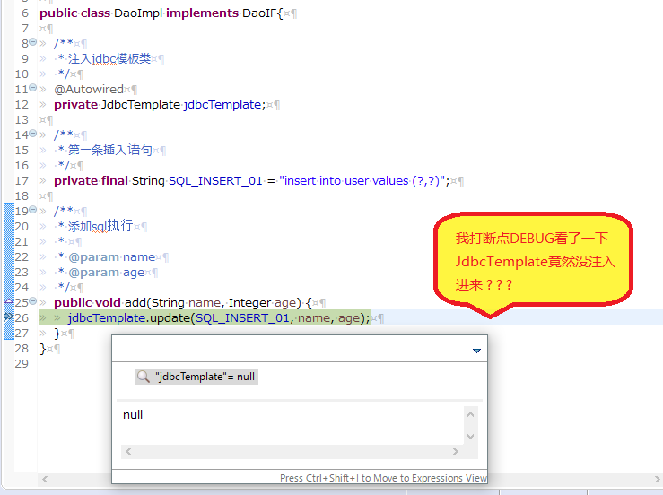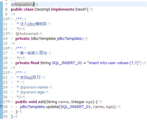 3 /** 4 * 注入jdbc模板类 5 */ 6 @Autowired 7 private JdbcTemplate jdbcTemplate; 8