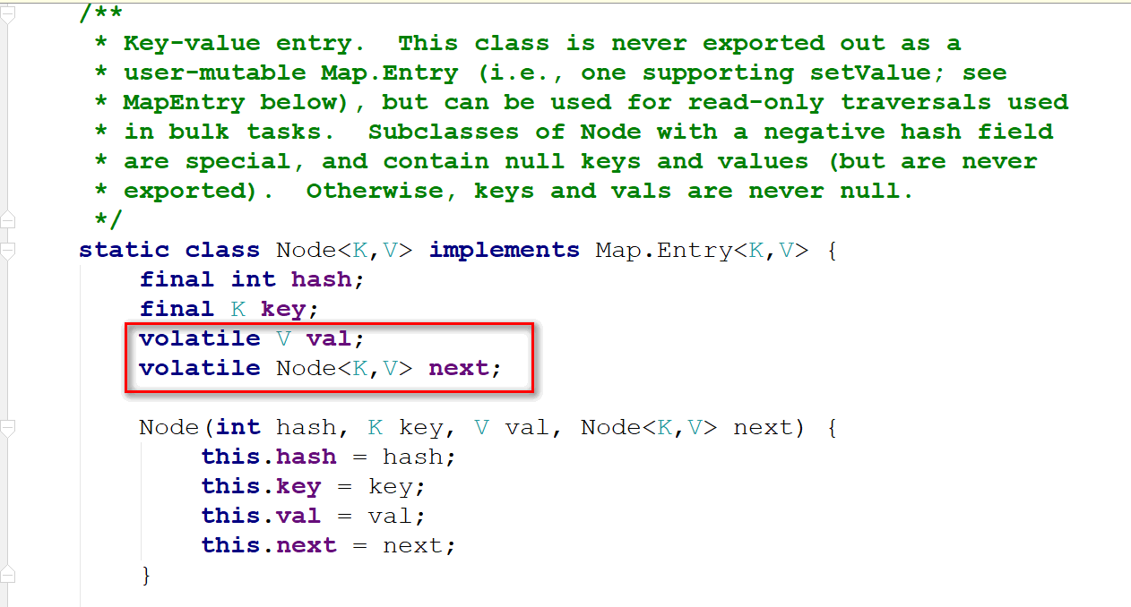 table数组、Node中的val和next、以及一些控制字段都加了volatile