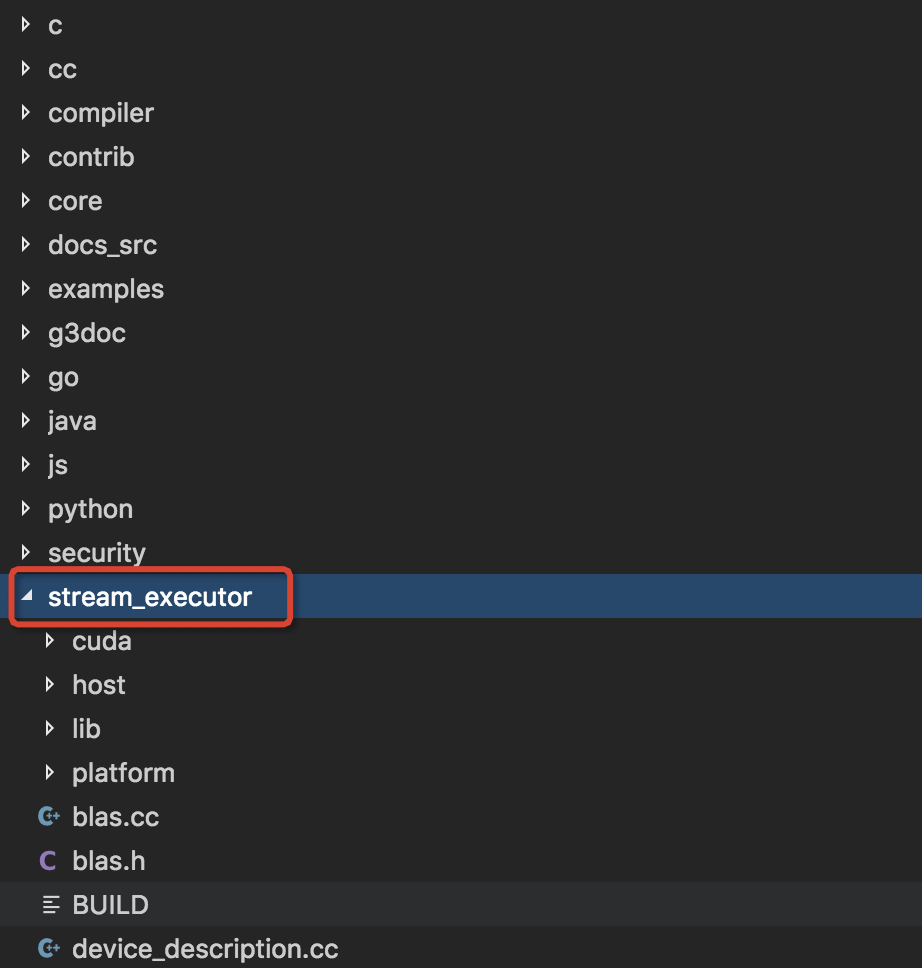 其实StreamExecutor本身就是一个在Google内部为并行编程模型开发的单独的库,感兴趣的可以直接参考GitHub。在TensorFlow中的StreamExecutor是一个开源StreamExecutor的简版,并且并不是以第三方库的形式出现,而是在源码中单独放了一个stream_executor的文件夹,里面的代码非常的精简,目录结构部分截图如下图所示。