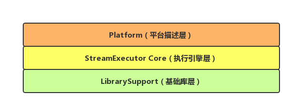 熟悉GPU编程的同学都知道,CUDA程序的编写是相对复杂的,不但要针对某种任务设计特定的并行编程思路,还要管理Event,Stream等较为底层的对象。为了能够减轻StreamExecutor用户的使用负担,也为了能够给上层调用者即TensorFlow引擎提供更加统一的接口,一些抽象分层的工作是非常有必要的。总体上StreamExecutor框架由三个层次组成,从上到下依次为Platform层(平台描述)、StreamExecutor Core层(执行引擎)和LibrarySupport层(基础库)。如果需要为TensorFlow添加新的计算设备种类,不但要向TensorFlow中注册Device的定义,还需要在StreamExecutor框架中提供负责管理该Device计算的代码。