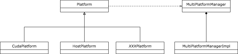 在StreamExecutor中Platform指的是计算所使用设备平台的抽象,每种Device对应一种Platform。比如GPU对应的是CudaPlatform,而CPU对应的是HostPlatform等。一旦获得了某种Device的Platform,就可以获取和该Platform对应的StreamExecutor Core以及相应的LibrarySupport。在TensorFlow的代码实现中,所有Platform类都是通过宏定义和MultiPlatformManager管理类的静态方法主动注册到系统中的,下面是这一层次的类图表示。